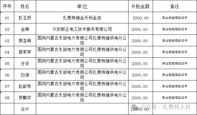扎赉特旗企业参保职工职业技能提升补贴发放明细表