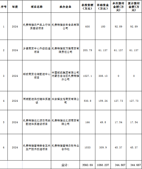 根据项目建设进度,结合《扎赉特旗2024年县域商业建设行动试点县重点项目阶段验收报告》,现将扎赉特旗县域商业建设行动重点项目中央专项资金拨付情况公示如下:
