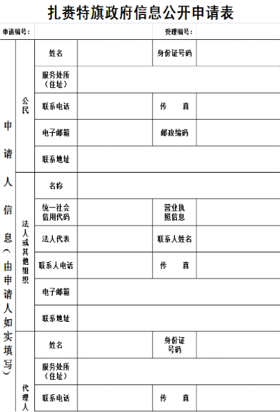 向扎赉特旗人民政府申请获取政府信息的申请人,应当填写《扎赉特旗公开申请表》(以下简称《申请表》)。申请表可以在扎赉特旗人民政府门户网站下载,复制有效。
