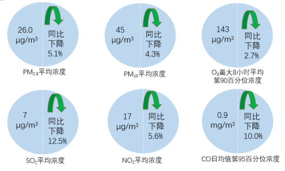 1—9月,全国339个地级及以上城市PM2.5平均浓度为26.0微克/立方米,同比下降5.1%;PM10平均浓度为45微克/立方米,同比下降4.3%;O3平均浓度为143微克/立方米,同比下降2.7%;SO2平均浓度为7微克/立方米,同比下降12.5%;NO2平均浓度为17微克/立方米,同比下降5.6%;CO平均浓度为0.9毫克/立方米,同比下降10.0%。
