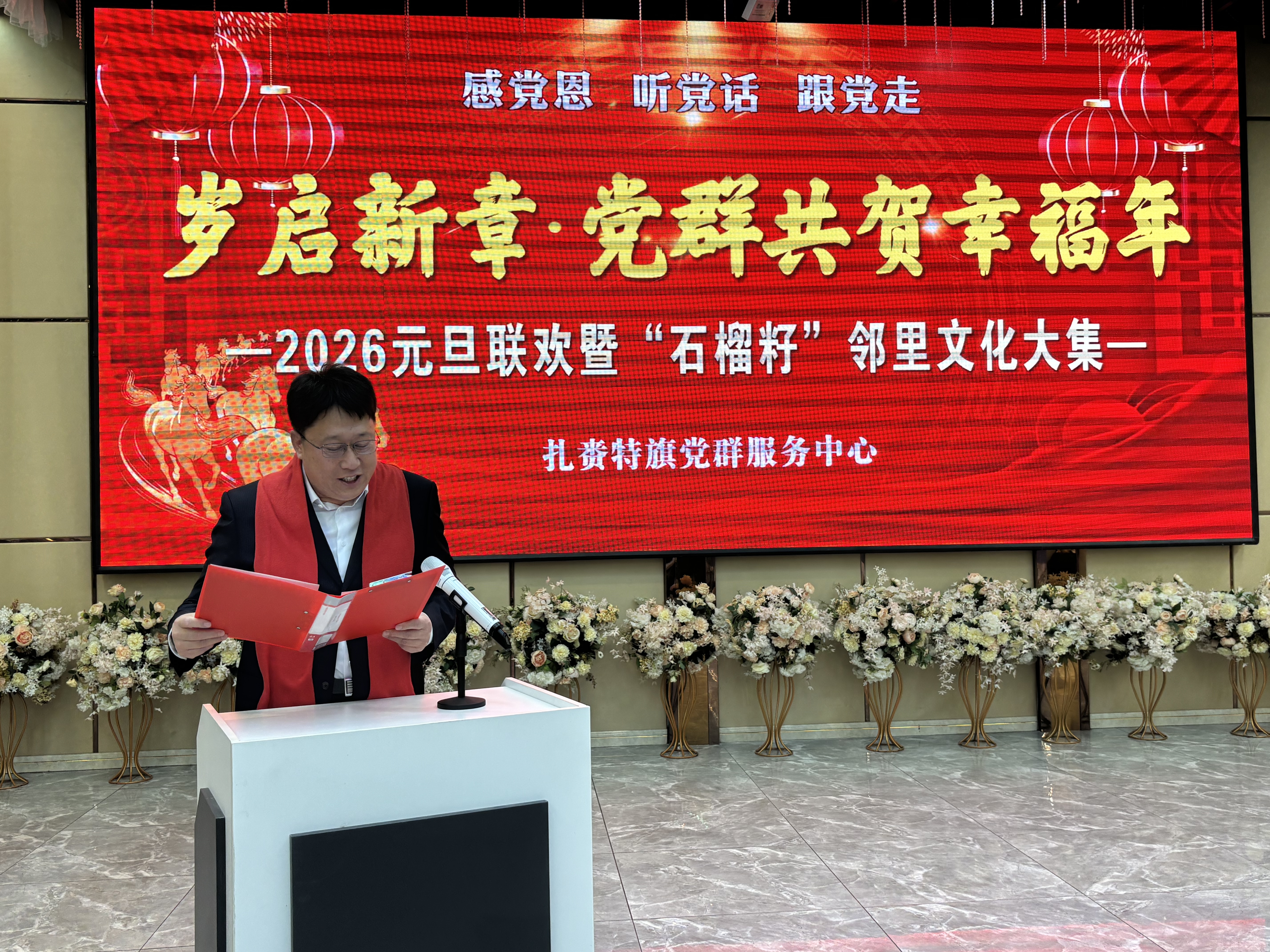 冬韵渐浓添暖意,党群同心谱新篇。扎赉特旗党群服务中心“岁启新章·党群共贺幸福年”2026元旦联欢暨“石榴籽”文化大集活动精彩启幕,以歌舞传情、以游戏助兴、以同心筑梦,在欢歌笑语中共迎元旦佳节,绘就党群一家亲、共筑幸福梦的美好画卷。
