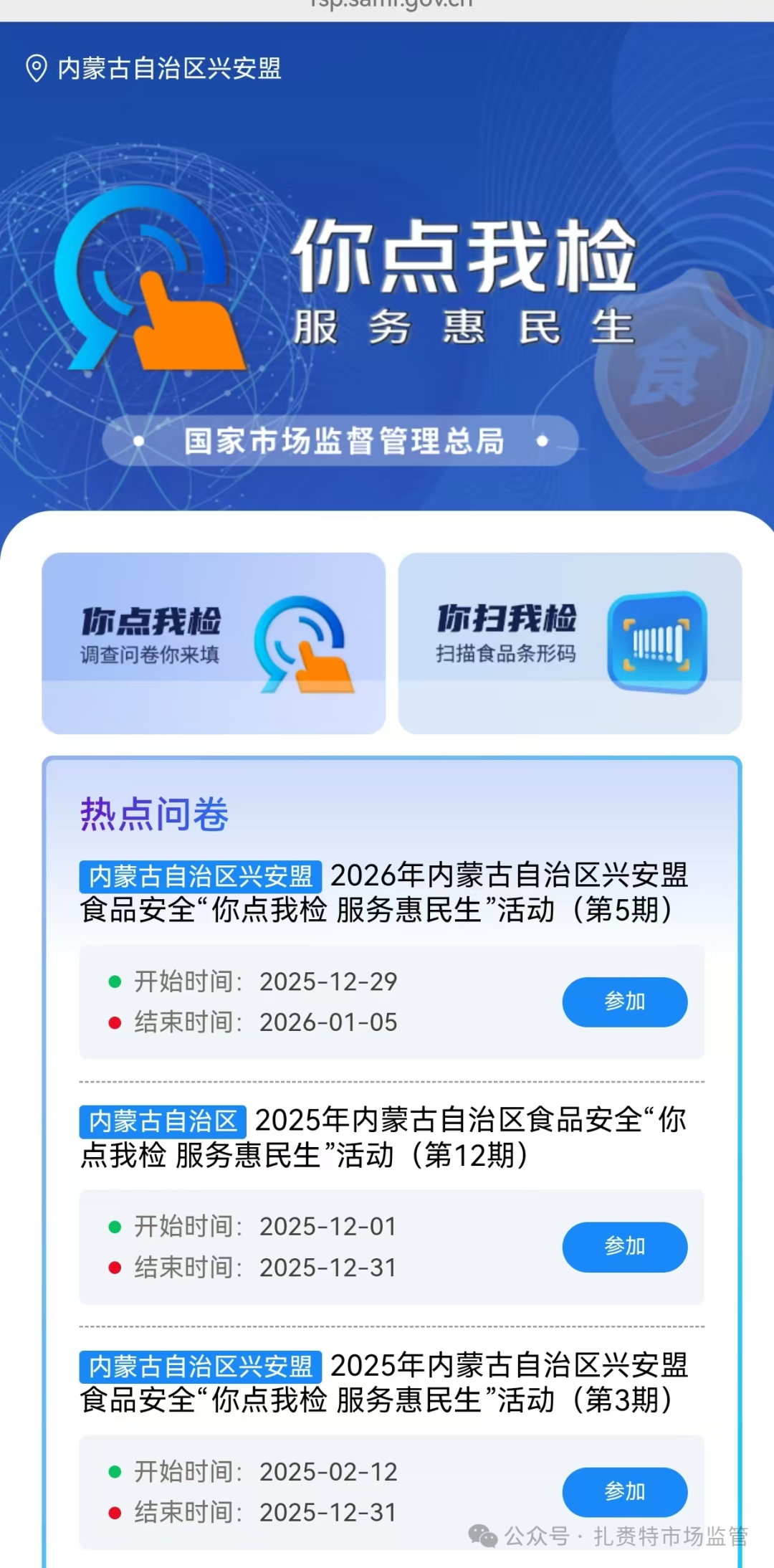 岁末迎新,为保障群众节日食品安全,让广大消费者度过一个欢乐、祥和的新年,扎赉特旗市场监督管理局拟于2025年12月29日至2026年1月5日期间开展2026年元旦期间食品安全“你点我检 服务惠民生”专项抽检活动。消费者可使用手机扫描下方二维码,选择2026年内蒙古自治区兴安盟食品安全“你点我检 服务惠民生”活动(第5期),