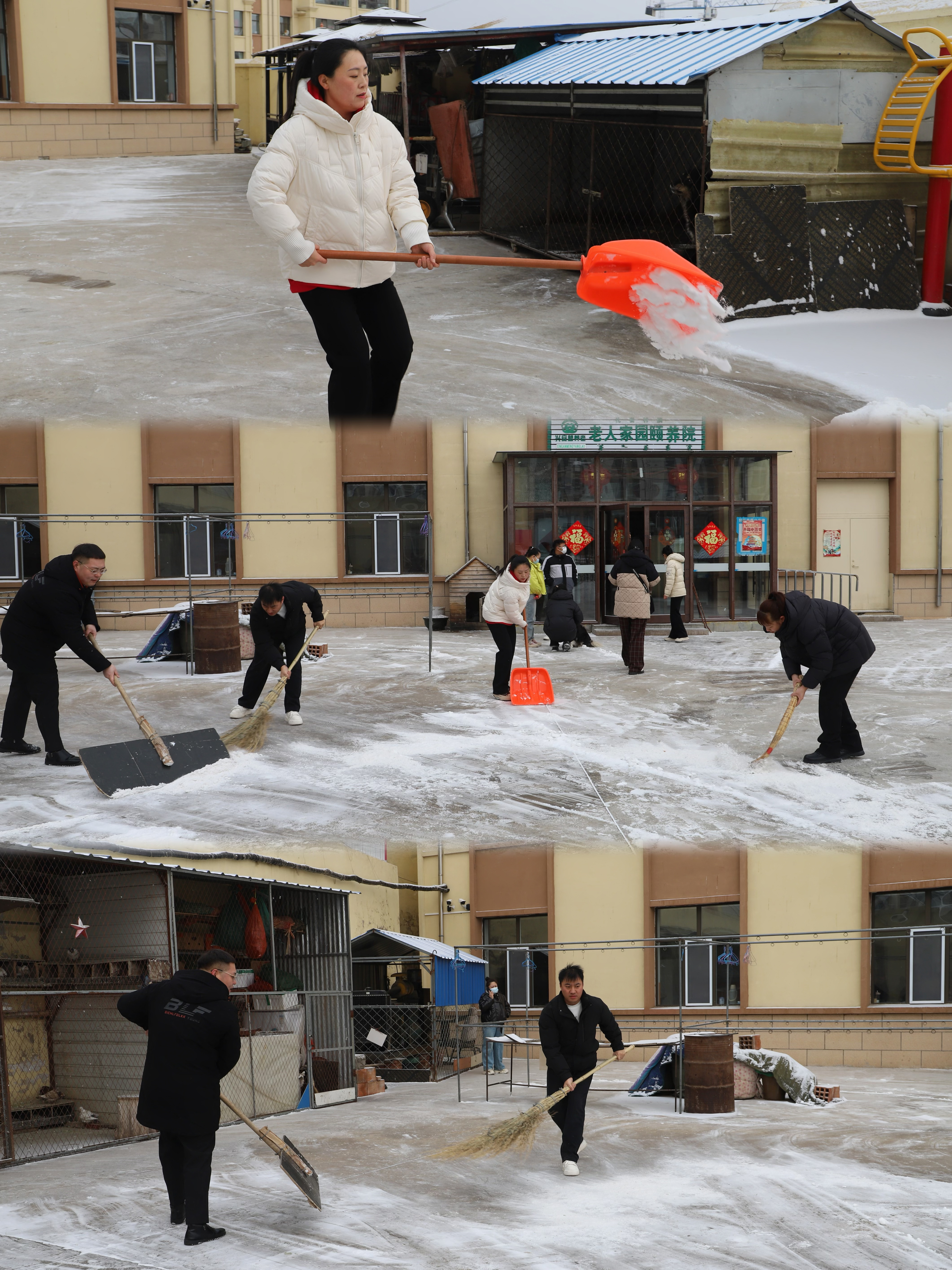 风雪无阻暖人心,扫雪除冰保平安。活动当天恰逢降雪天气,社区工作人员与志愿者们提前抵达颐养院,拿起铁锹、扫帚等工具,分工协作、默契配合,对院内活动场地、出入口等重点区域的积雪进行全面清理。大家不畏严寒、干劲十足,铲雪、扫雪、除冰一气呵成,志愿者们用实际行动消除安全隐患,为老人们营造安全整洁的活动环境,以点滴行动守护老人平安出行,让风雪中的颐养院暖意融融。