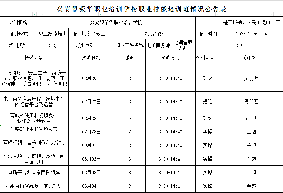 根据内蒙古自治区财政厅 内蒙古自治区人力资源和社会保障厅《关于转发就业补助资金管理办法的通知》(内财社〔2024〕373号)文件及兴安盟关于做好就业创业培训工作等相关文件精神和要求,现将认定合格的培训机构开办的补贴性职业技能培训班有关情况进行公告,接受社会各界和群众监督。如有异议,请向扎赉特旗人力资源和就业服务中心进行反映。