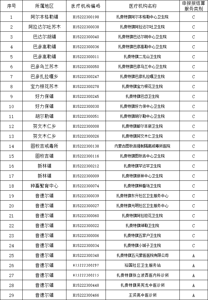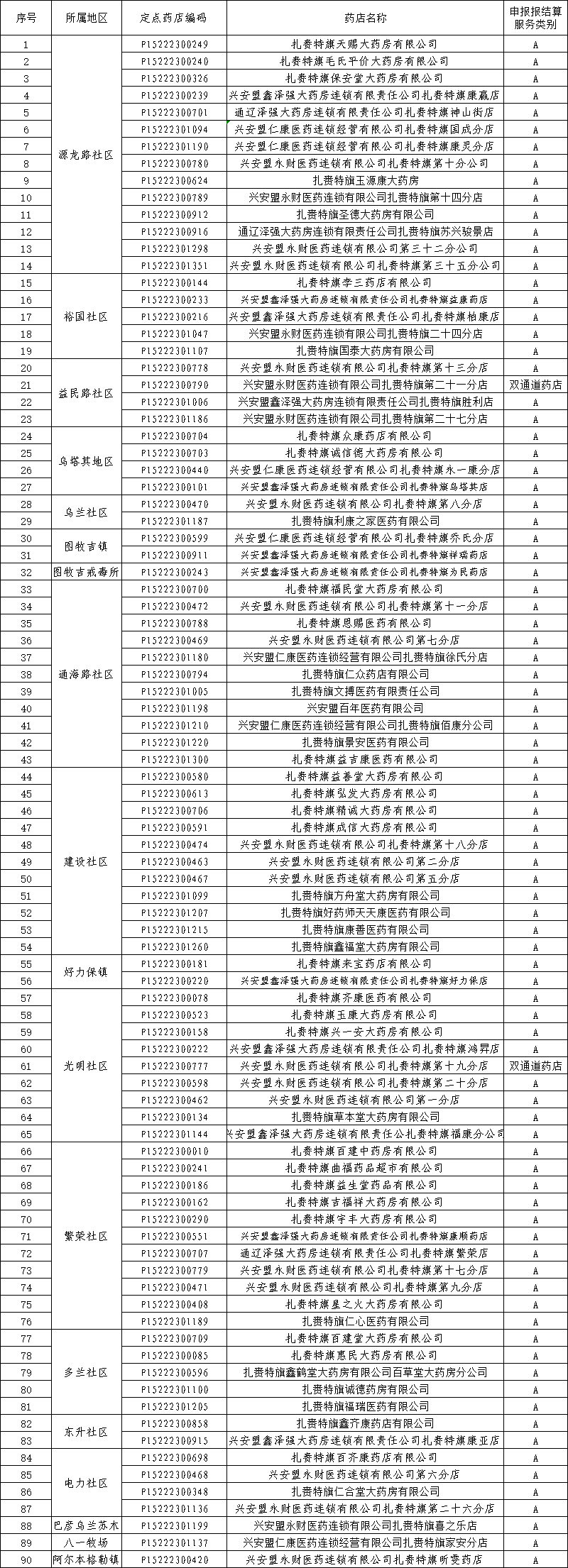 根据《内蒙古自治区医疗保障局关于印发定点医药机构医保结算分级管理办法(试行)的通知》(内医保发(2024)16号)和《内蒙古自治区医疗保障局关于落实医保定点医药机构资源配置规划的通知》(内医保办字(2025)16号)等文件精神,结合扎赉特旗现有医保定点资源及公众医疗服务需求等因素,经盟、旗两级医保行政部门综合评估和党组决议,现将我旗拟签订2025年医保定点服务协议的29家一级及以下定点医疗机构和90家定点零售药店名单公示如下:
