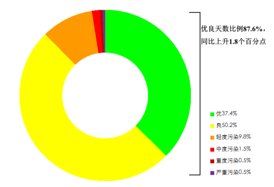1—9月,全国339个地级及以上城市平均空气质量优良天数比例为87.6%,同比上升1.8个百分点;平均重度及以上污染天数比例为1.1%,同比持平。由沙尘天气导致的平均超标天数比例为3.1%,其中重度及以上污染天数比例为0.7%。