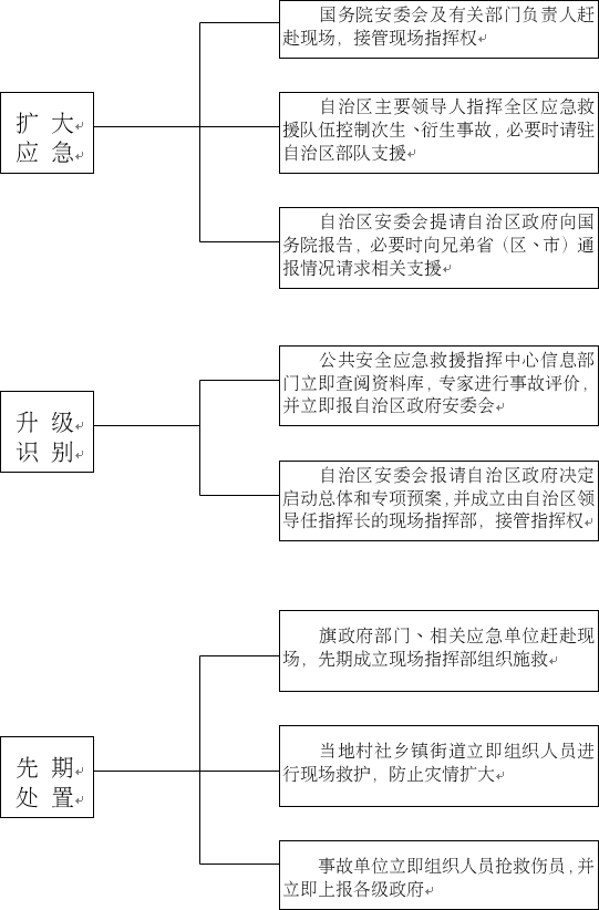 在旗人民政府的统一领导和旗安委会的综合协调下,各有关部门按照职责负责其相关专业领域的应急指挥工作,建立相关专业的应急指挥机构以及应急联动工作机制,制订、管理并实施本部门相关应急预案,做好相关专业领域的公共安全事故应对工作。