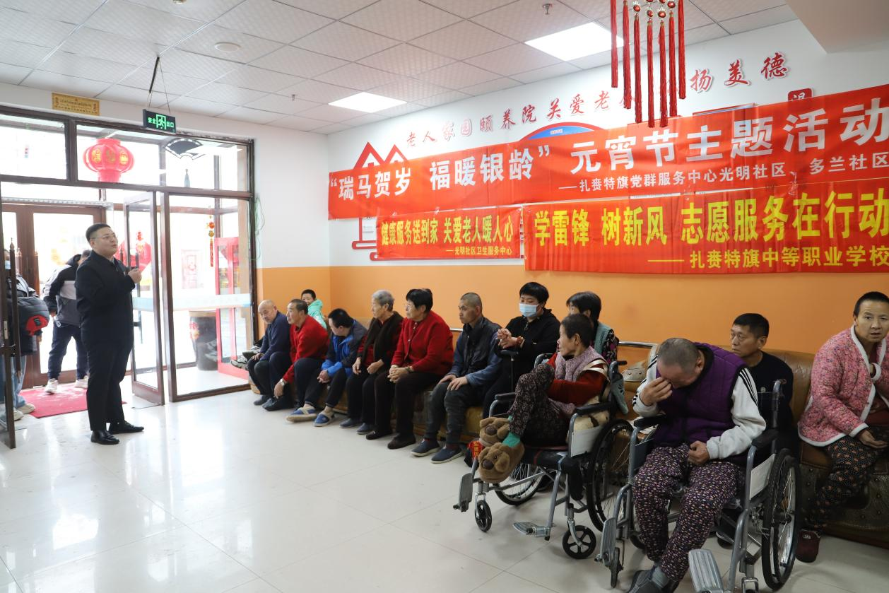 元宵佳节暖意浓,敬老爱老情意重。为弘扬中华优秀传统文化,丰富老年居民精神文化生活,营造欢乐祥和、温馨向善的节日氛围,3月3日,扎赉特旗党群服务中心光明社区联合多兰社区、光明社区卫生服务中心及扎赉特旗中等职业学校,共同走进老人家园颐养院,开展“瑞马贺岁福暖银铃”元宵节敬老爱老主题文明实践活动。