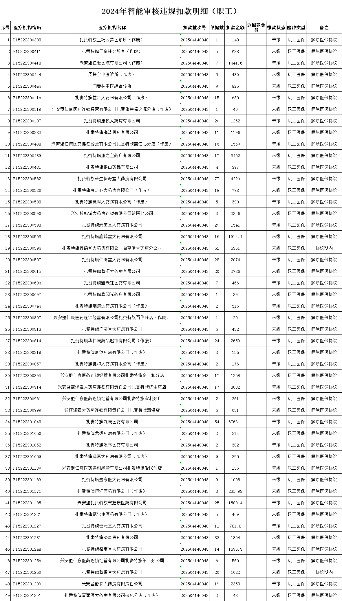 经核查,以下机构在2024年存在违规使用医保基金的情况(详见附件明细),经医疗保障智能审核系统审核,确认违反了《医疗保障基金使用监督条例》的规定,致使医疗保障基金受损。依据《医疗保障基金使用监督条例》(中华人民共和国国务院令 第735号)第三十八条、2024年兴安盟医疗保障定点零售药店协议第九条的规定,现依法公告送达相关追回事宜,具体要求如下: