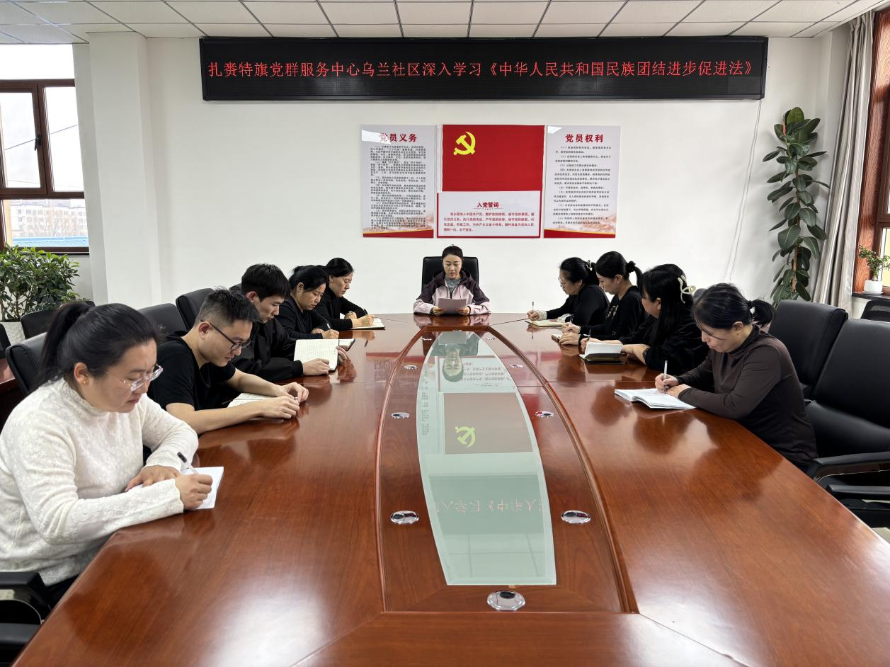 为切实提升基层工作人员依法开展民族工作的能力,近日,乌兰社区组织全体工作人员召开专题学习会,以法治赋能基层治理,筑牢民族团结思想根基,推动辖区各族群众凝心聚力、和睦共处。